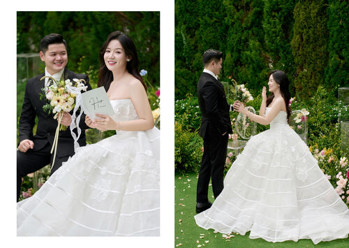 “Tiếng trái tim đôi ta đập thật nhanh. Thì thầm lời yêu thương. Ngày tình về chung đôi...” Sau bao nhiêu chờ đợi, cuối cùng ngày vui của chúng ta cũng tới rồi. Cảm ơn vì mình đã luôn là một phần trong cuộc sống của nhau. Em và anh không chỉ là người yêu mà chúng ta còn là tri kỷ. Ngày hôm nay, em sẽ là cô dâu của anh và sau này sẽ là mẹ của các con anh.